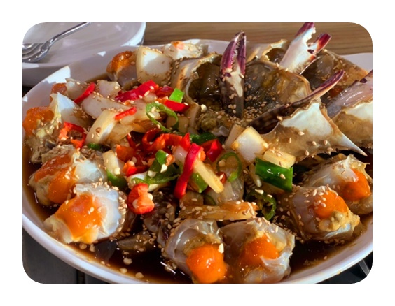메뉴 : 암꽃게 정식코스(1인) 35,000원 숫꽃게 정식 코스요리(1인) 25,000원 수제등심돈까스 12,000원 새우튀김 10,000원 크림새우강정 15,000원 전어구이 15,000원 날치알밥 8,000원